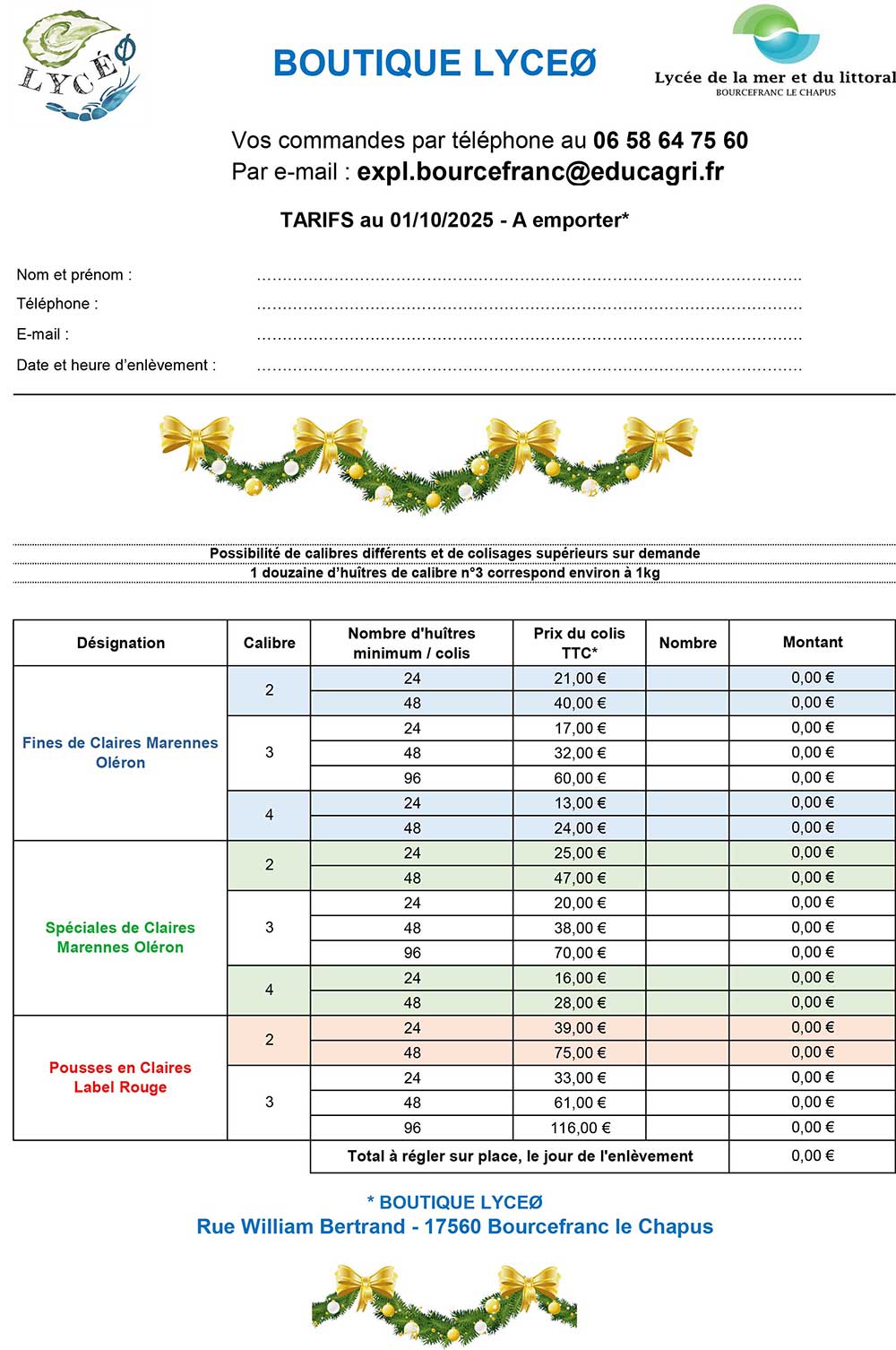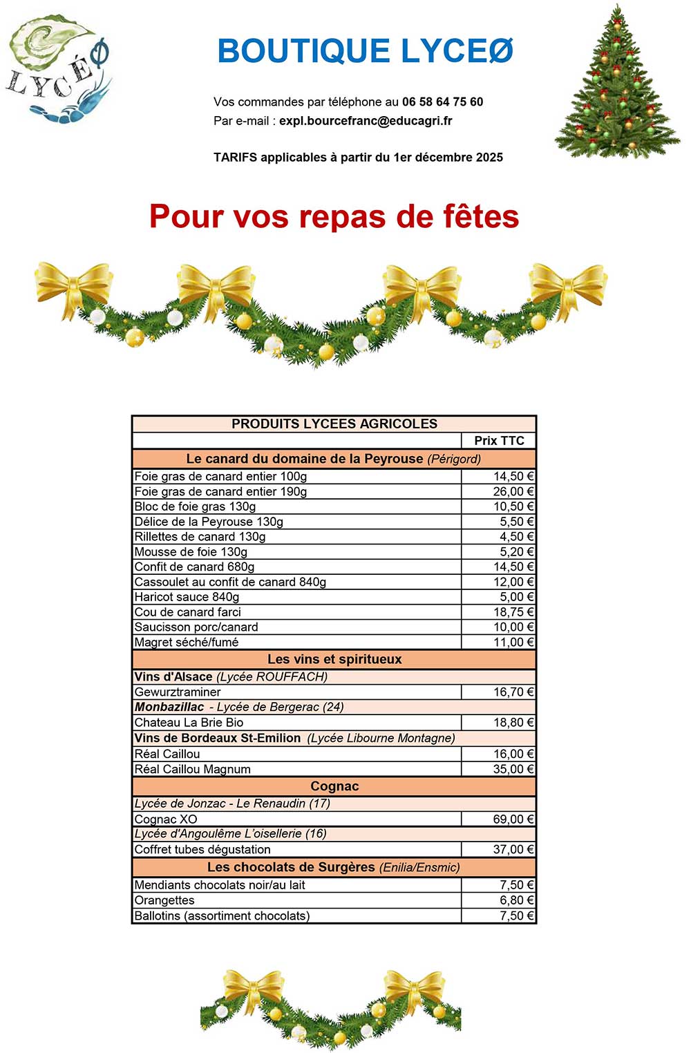 Tarifs (cantine, internat..)